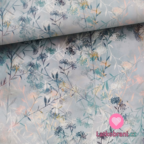 Teplákovina potlač zimné vetvičky a púpavové páperie na šedej