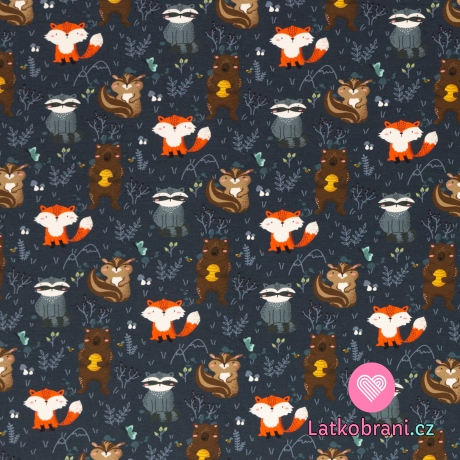 Teplákovina potlač lesné zvieratká na tmavo modré, ľahko počesaná