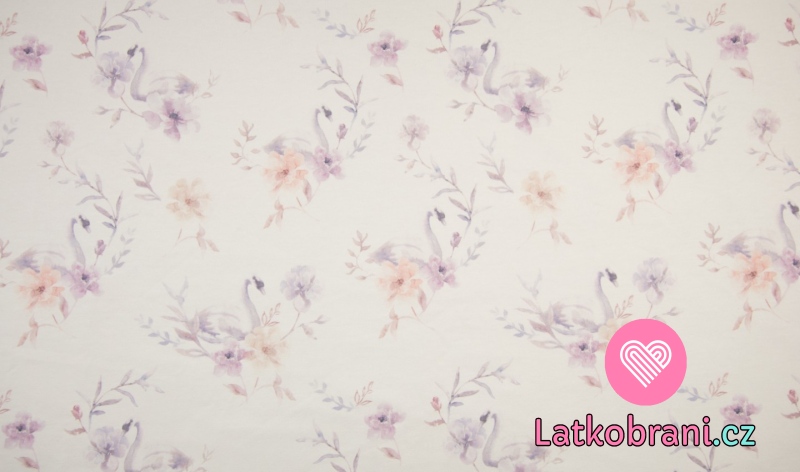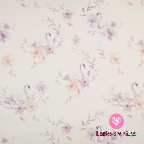 Teplákovina z organickej bavlny potlač labuť medzi kvetinami do fialova na bielej